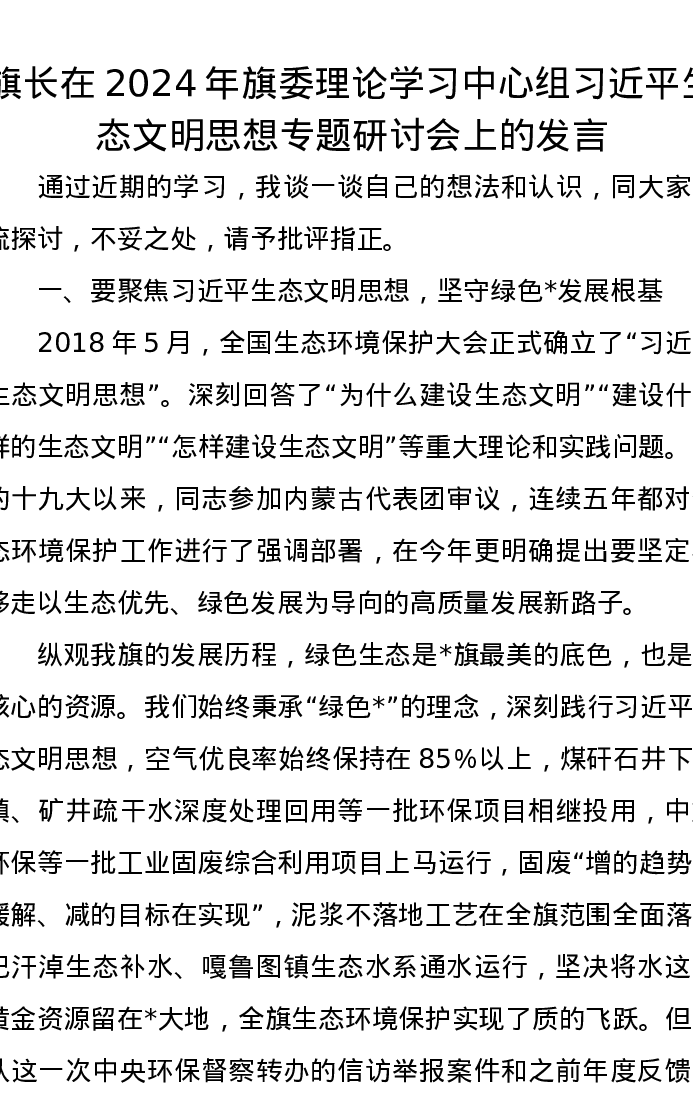 旗长在2024年旗委理论学习中心组习近平生态文明思想专题研讨会上的发言