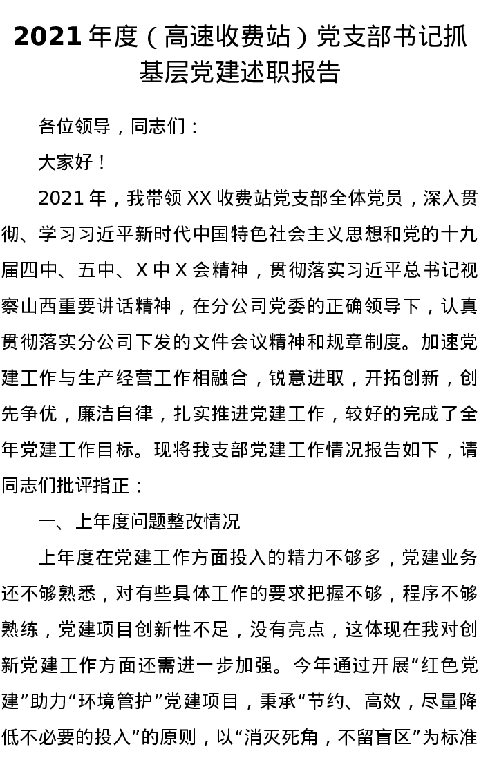 20220108-2021年度(高速收费站)党支部书记抓基层党建述职报告