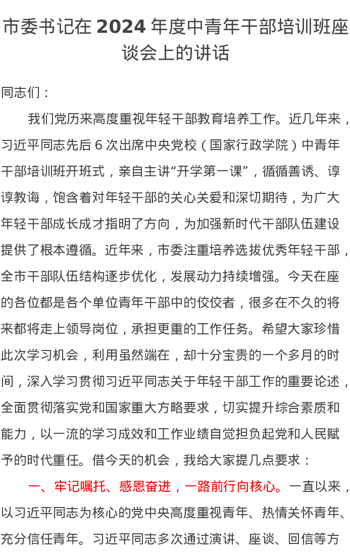 市委书记在2024年度中青年干部培训班座谈会上的讲话