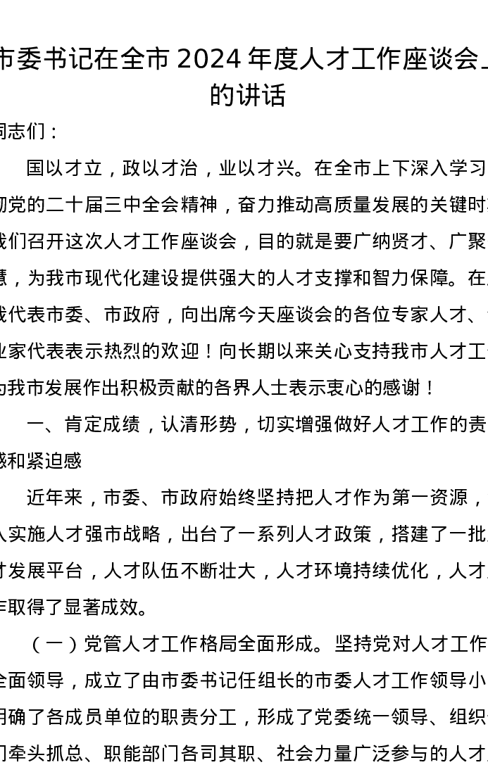 市委书记在全市2024年度人才工作座谈会上的讲话