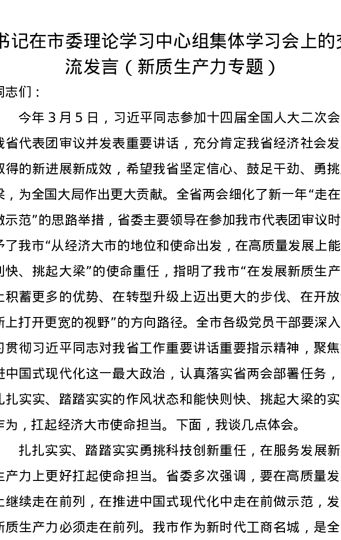 书记在市委理论学习中心组集体学习会上的交流发言(新质生产力专题)