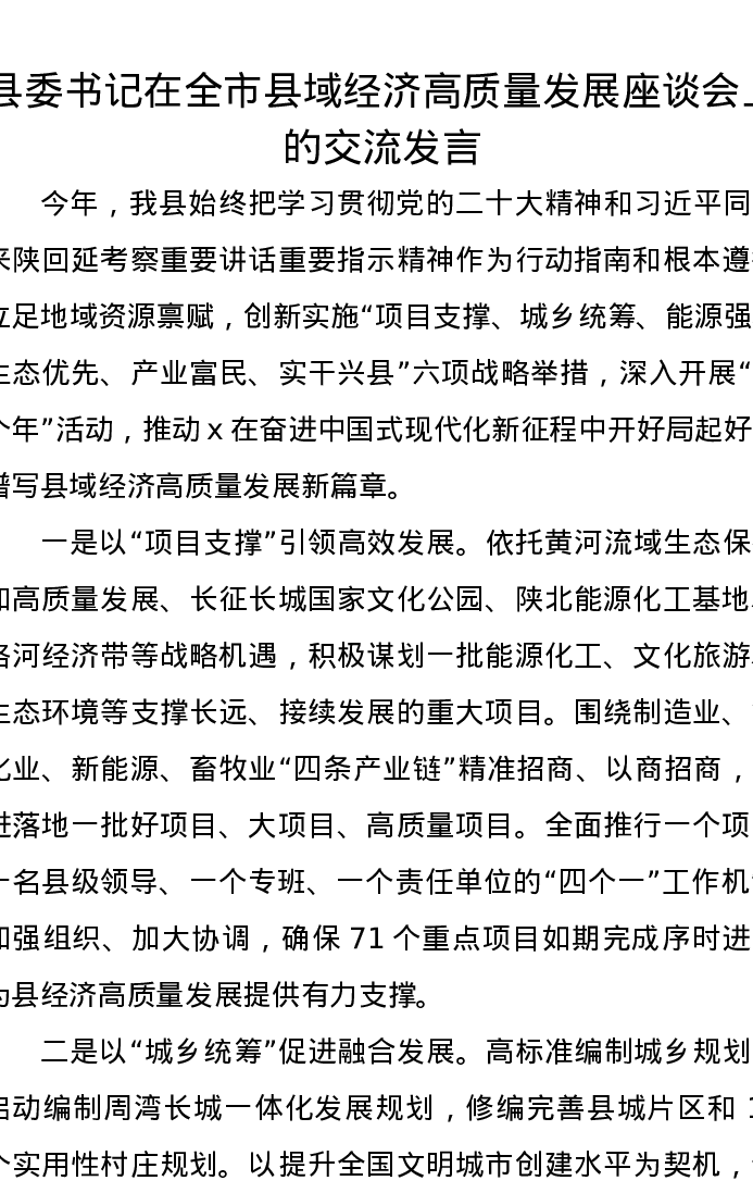 县委书记在全市县域经济高质量发展座谈会上的交流发言