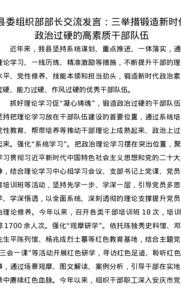 县委组织部部长交流发言:三举措锻造新时代政治过硬的高素质干部队伍