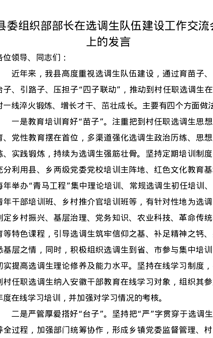 县委组织部部长在选调生队伍建设工作交流会上的发言