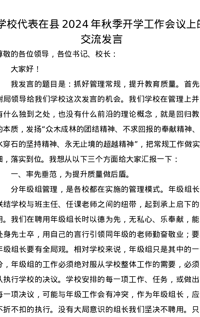 学校代表在县2024年秋季开学工作会议上的交流发言