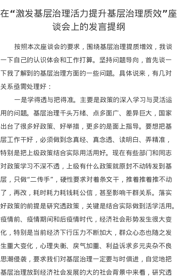 在“激发基层治理活力提升基层治理质效”座谈会上的发言提纲