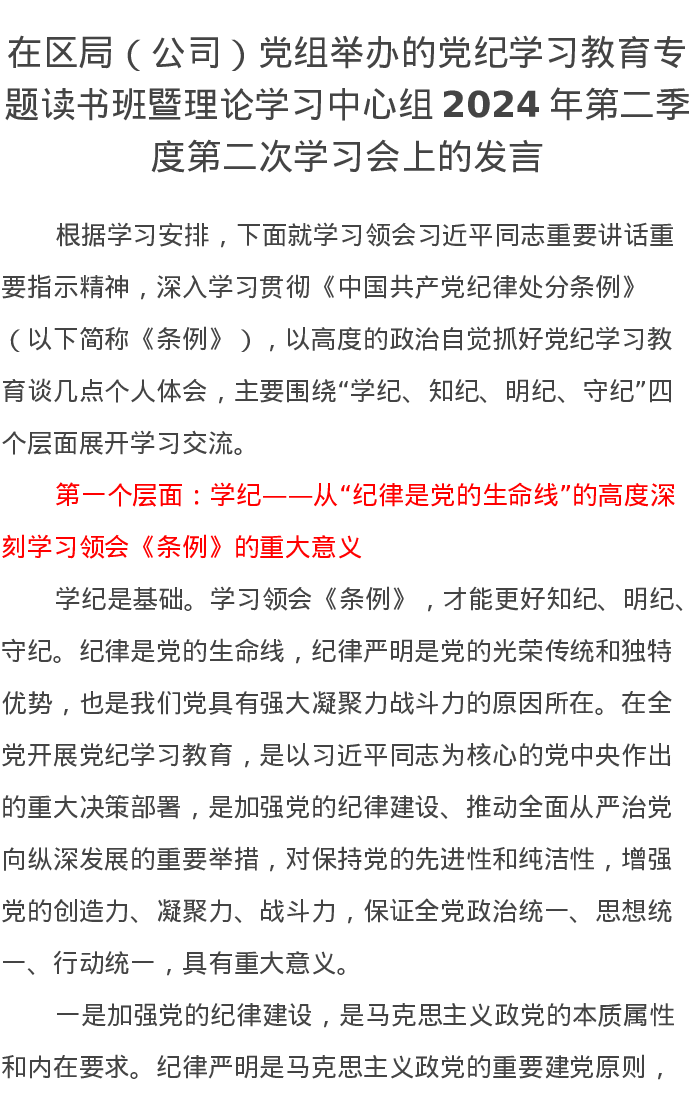 在区局(公司)党组举办的党纪学习教育专题读书班暨理论学习中心组2024年第二季度第二次学习会上的发言