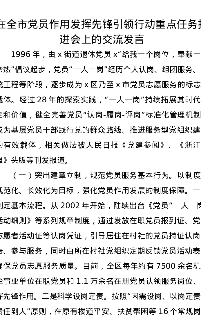 在全市党员作用发挥先锋引领行动重点任务推进会上的交流发言
