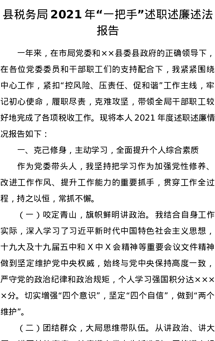 20220109县税务局2021年“一把手”述职述廉述法报告