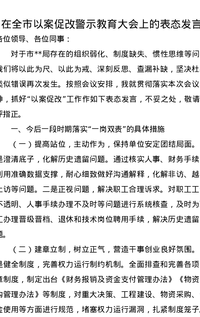 在全市以案促改警示教育大会上的表态发言