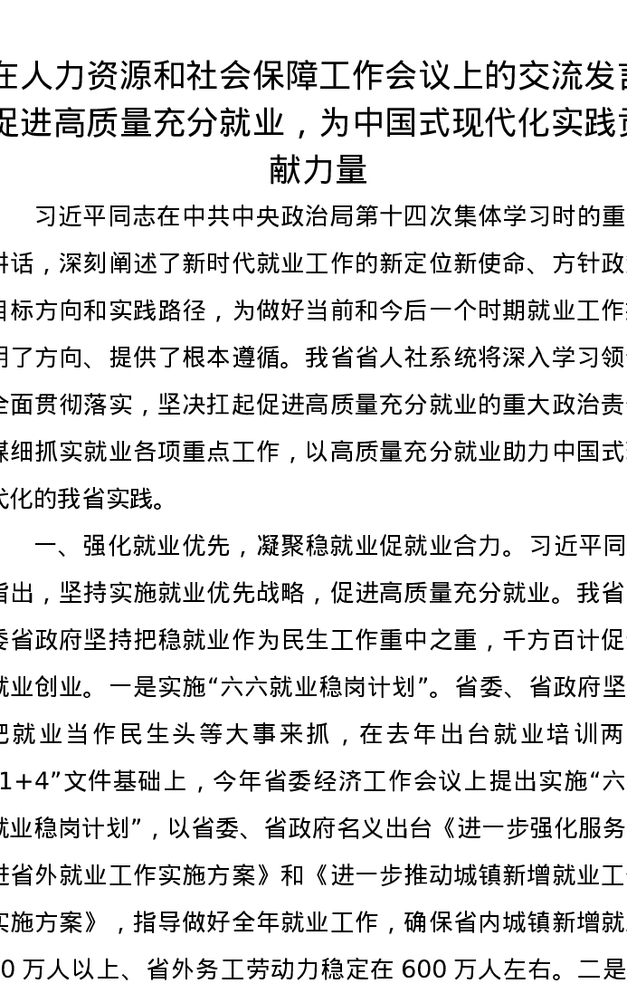 在人力资源和社会保障工作会议上的交流发言:促进高质量充分就业,为中国式现代化实践贡献力量