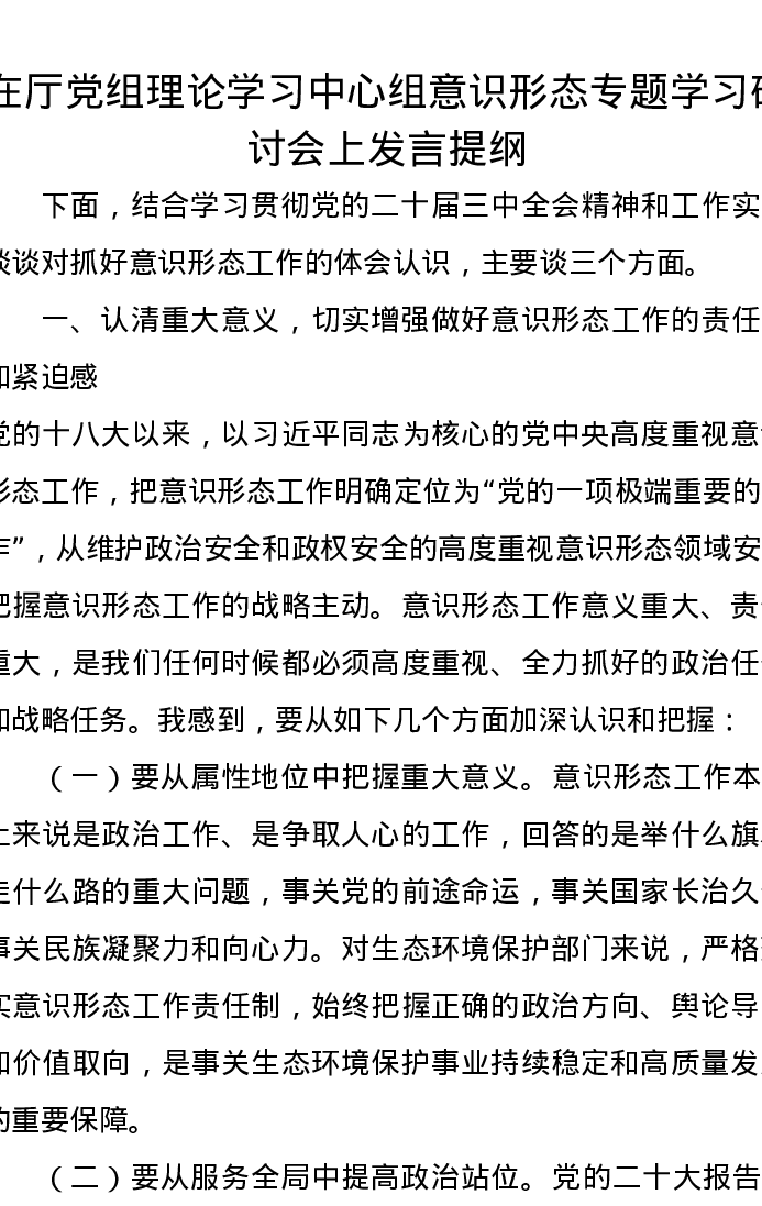 在厅党组理论学习中心组意识形态专题学习研讨会上发言提纲