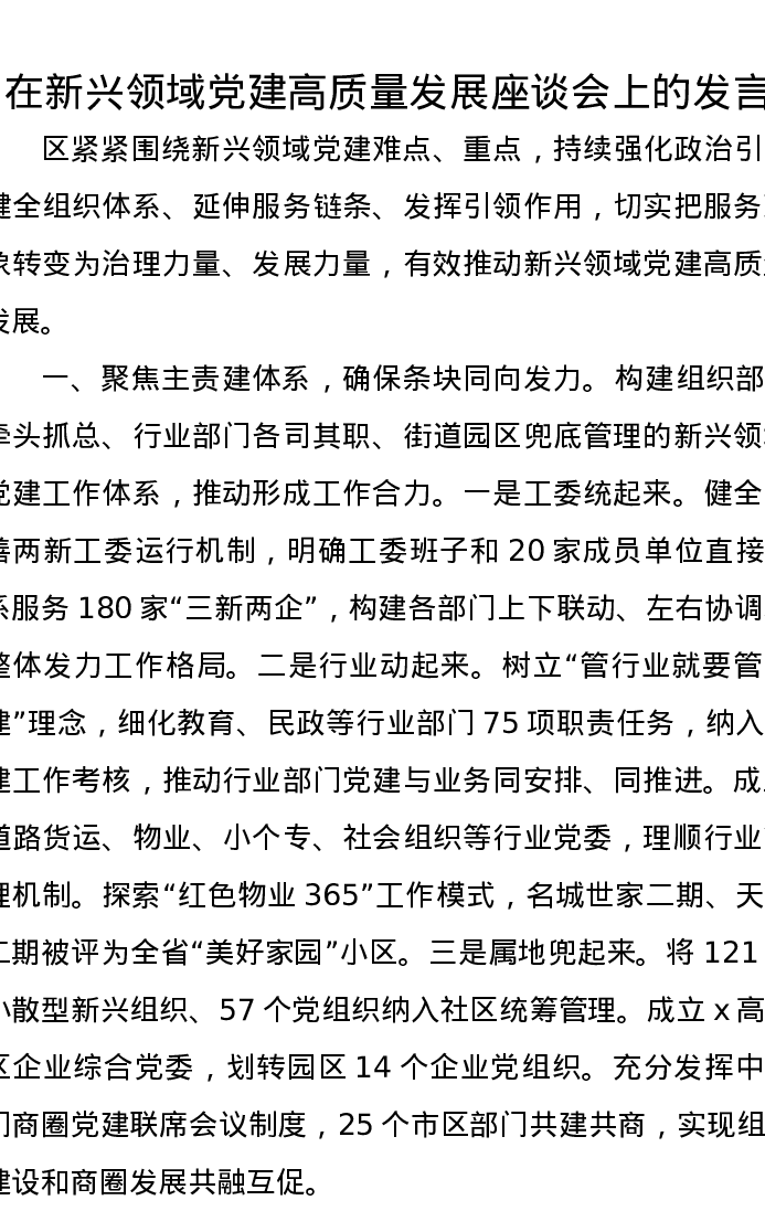 在新兴领域党建高质量发展座谈会上的发言