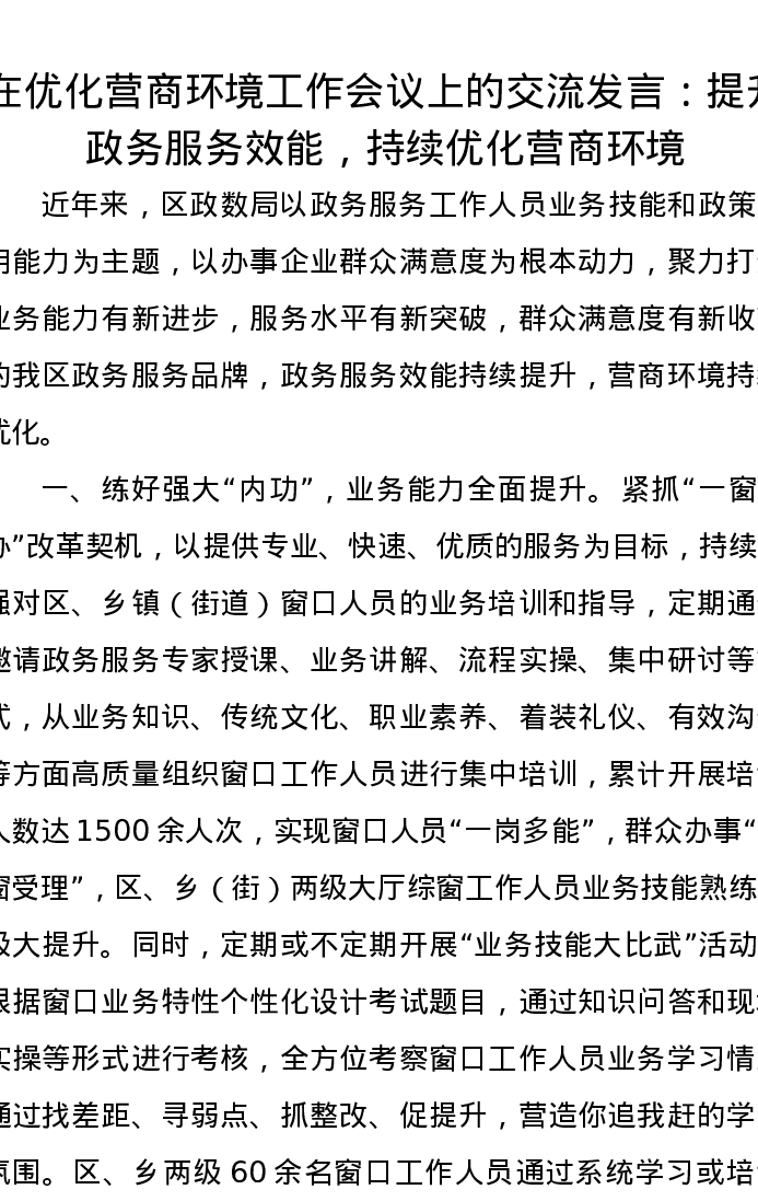 在优化营商环境工作会议上的交流发言:提升政务服务效能,持续优化营商环境