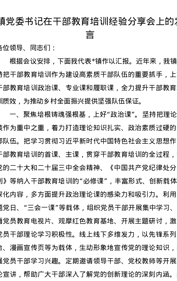 镇党委书记在干部教育培训经验分享会上的发言