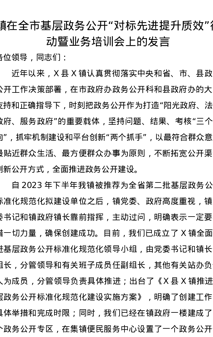 镇在全市基层政务公开“对标先进提升质效”行动暨业务培训会上的发言