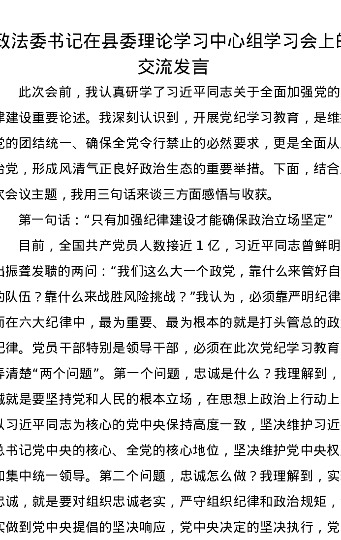政法委书记在县委理论学习中心组学习会上的交流发言