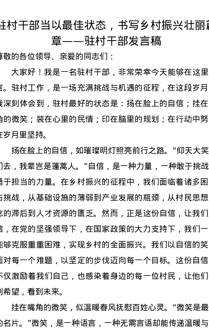 驻村干部当以最佳状态,书写乡村振兴壮丽篇章——驻村干部发言稿