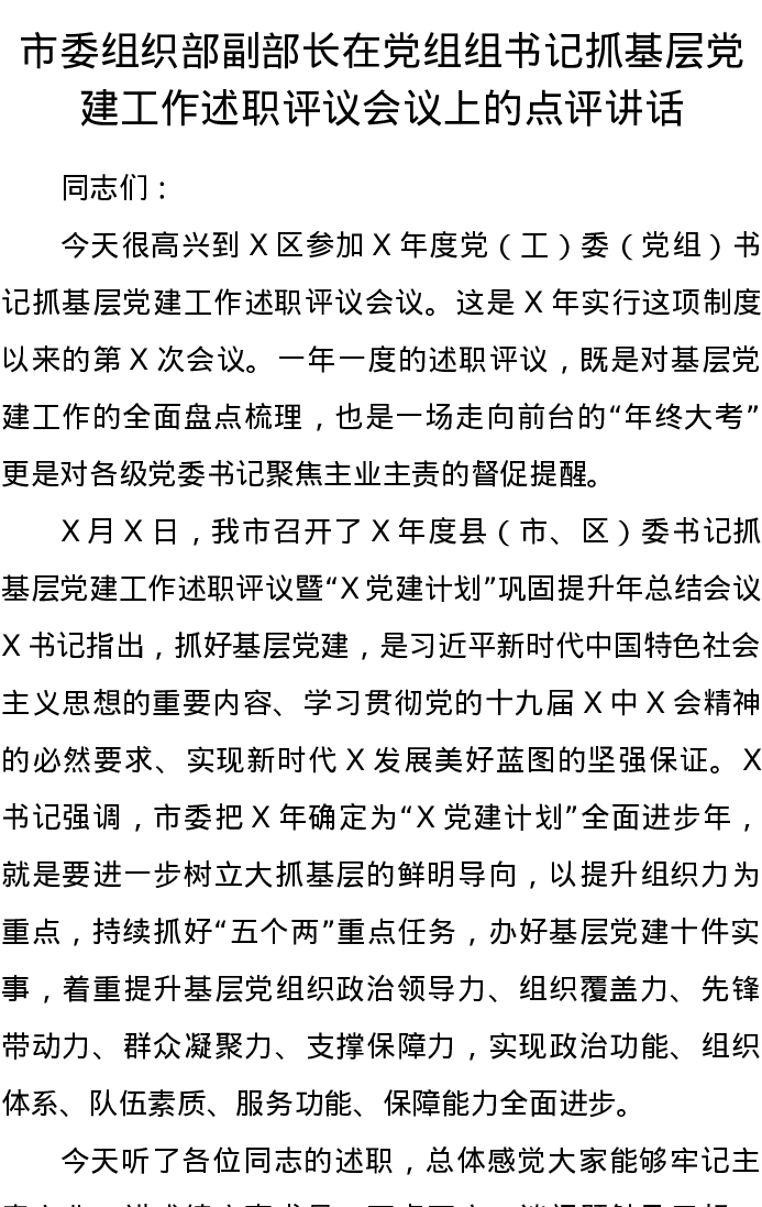 20220111市委组织部副部长在党组组书记抓基层党建工作述职评议会议上的点评讲话
