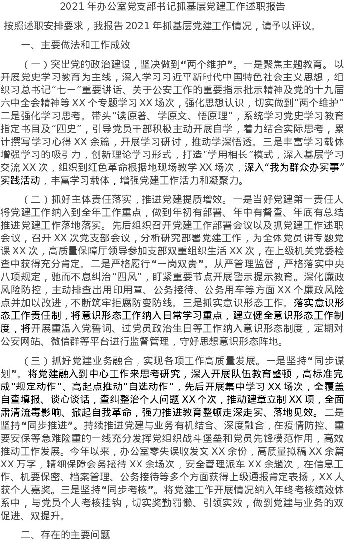 20220114-2021年办公室党支部书记抓基层党建工作述职报告