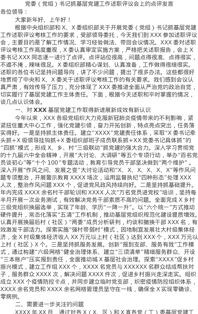 20220114党委(党组)书记抓基层党建工作述职评议会上的点评发言