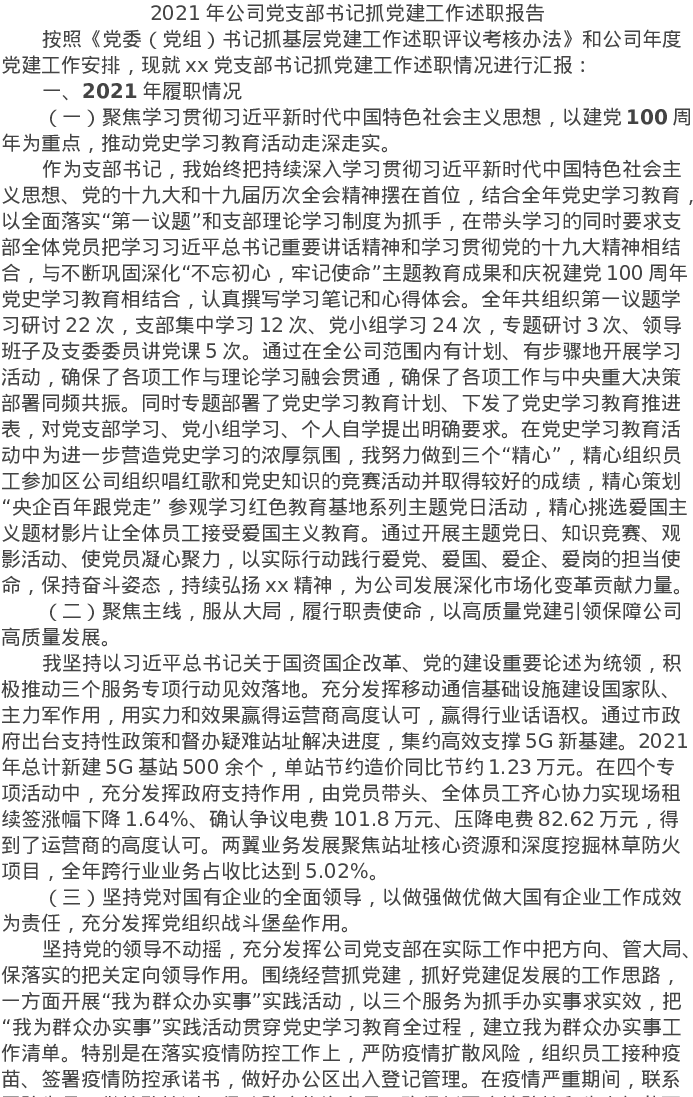 20220118-2021年公司党支部书记抓党建工作述职报告