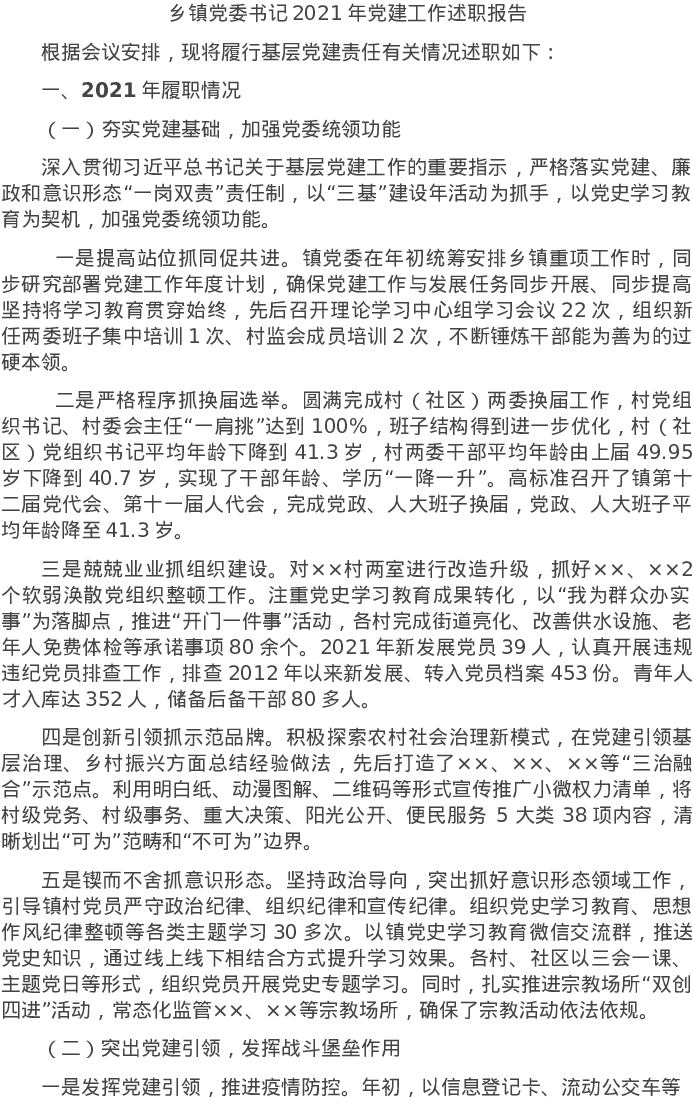 20220118乡镇党委书记2021年党建工作述职报告