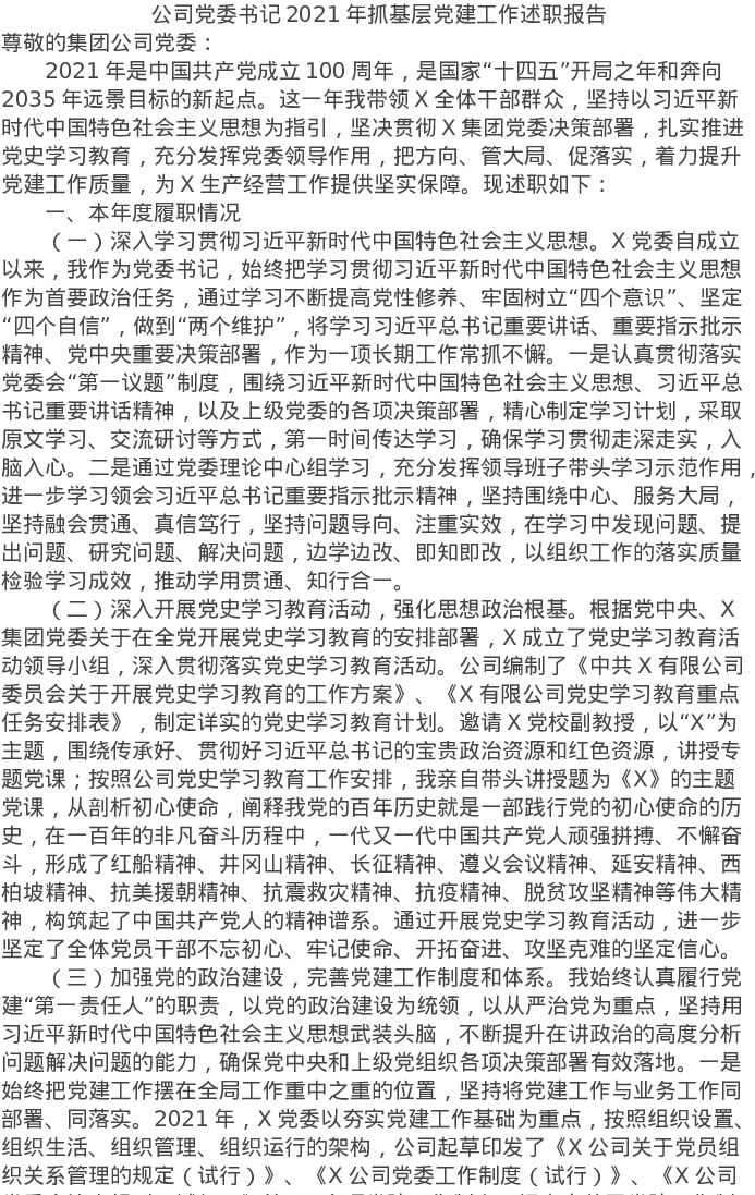 20220119公司党委书记2021年抓基层党建工作述职报告