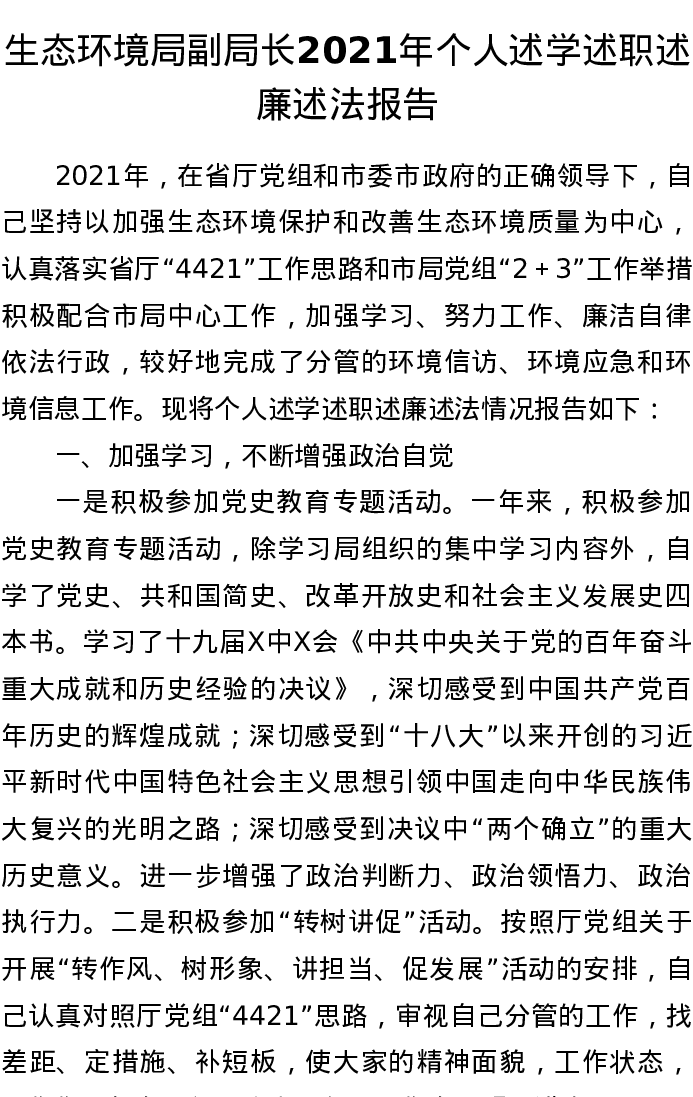 20220120生态环境局副局长2021年个人述学述职述廉述法报告