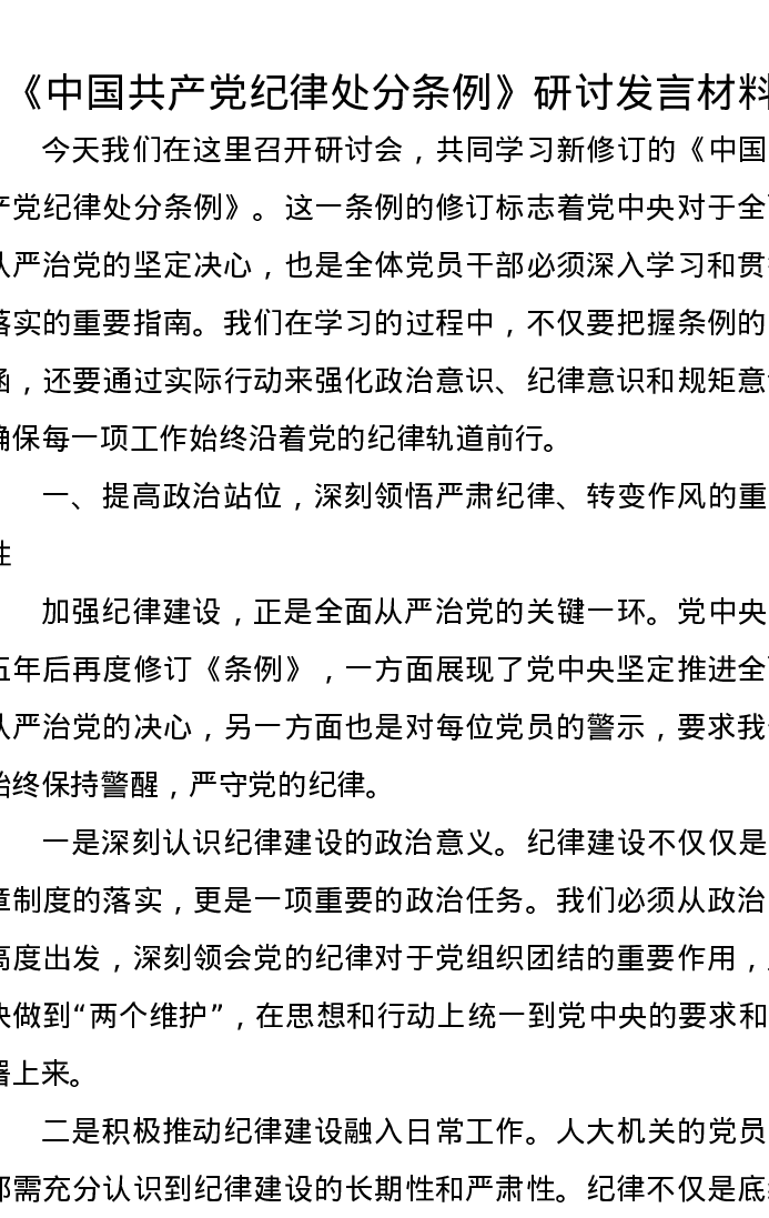 《中国共产党纪律处分条例》研讨发言材料