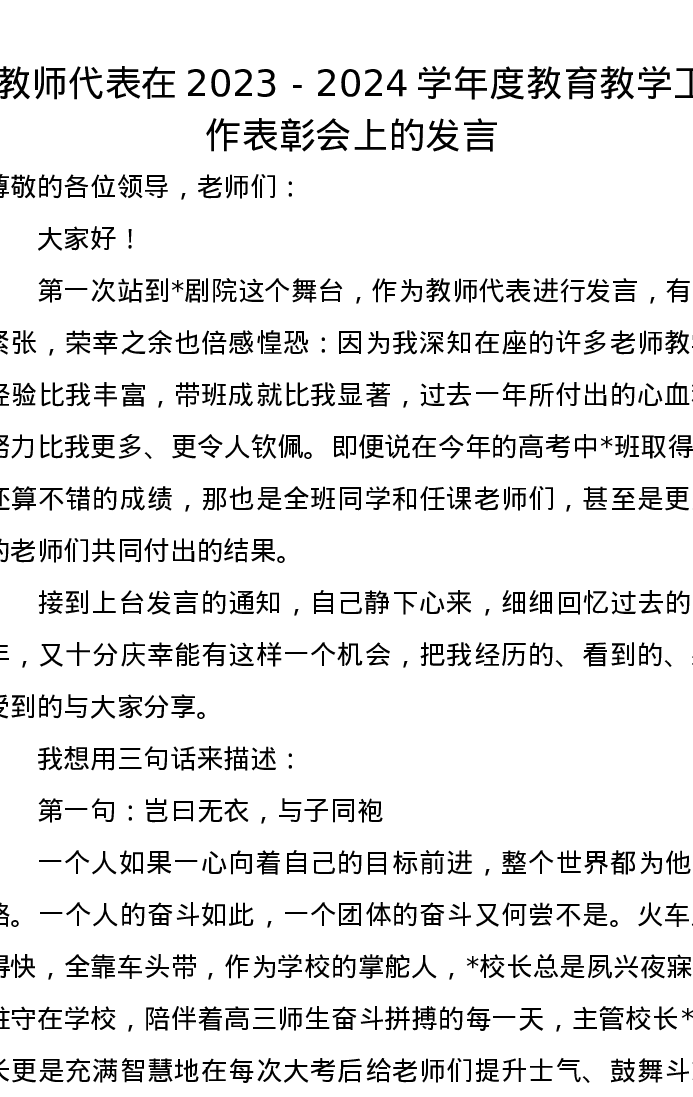 教师代表在2023-2024学年度教育教学工作表彰会上的发言