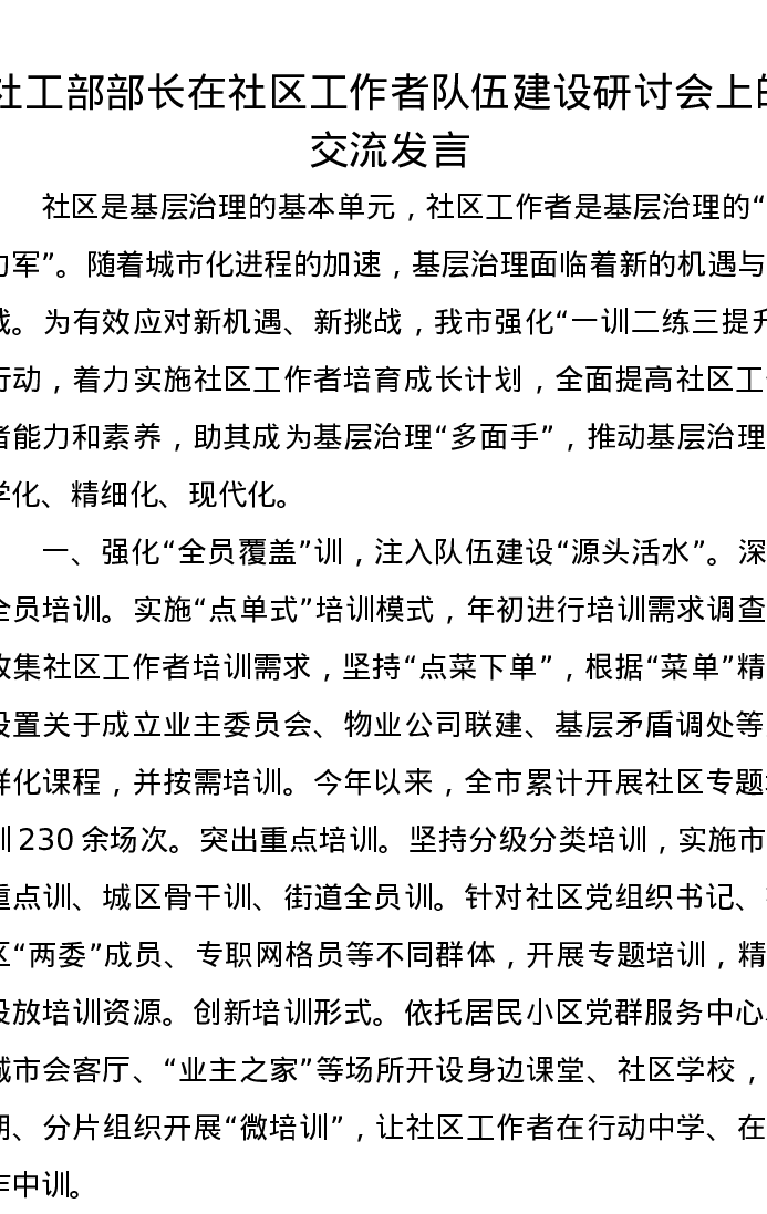 社工部部长在社区工作者队伍建设研讨会上的交流发言