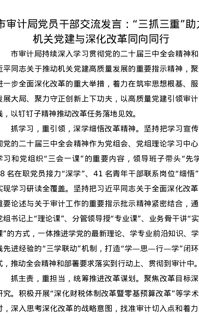 市审计局党员干部交流发言:“三抓三重”助力机关党建与深化改革同向同行