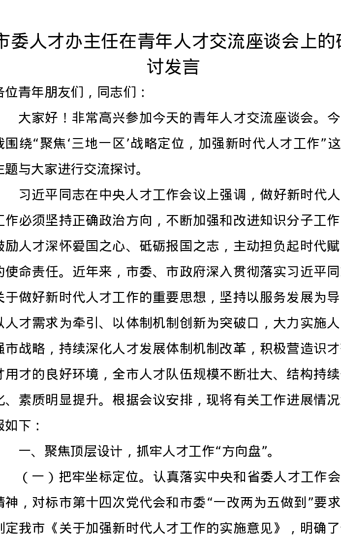 市委人才办主任在青年人才交流座谈会上的研讨发言