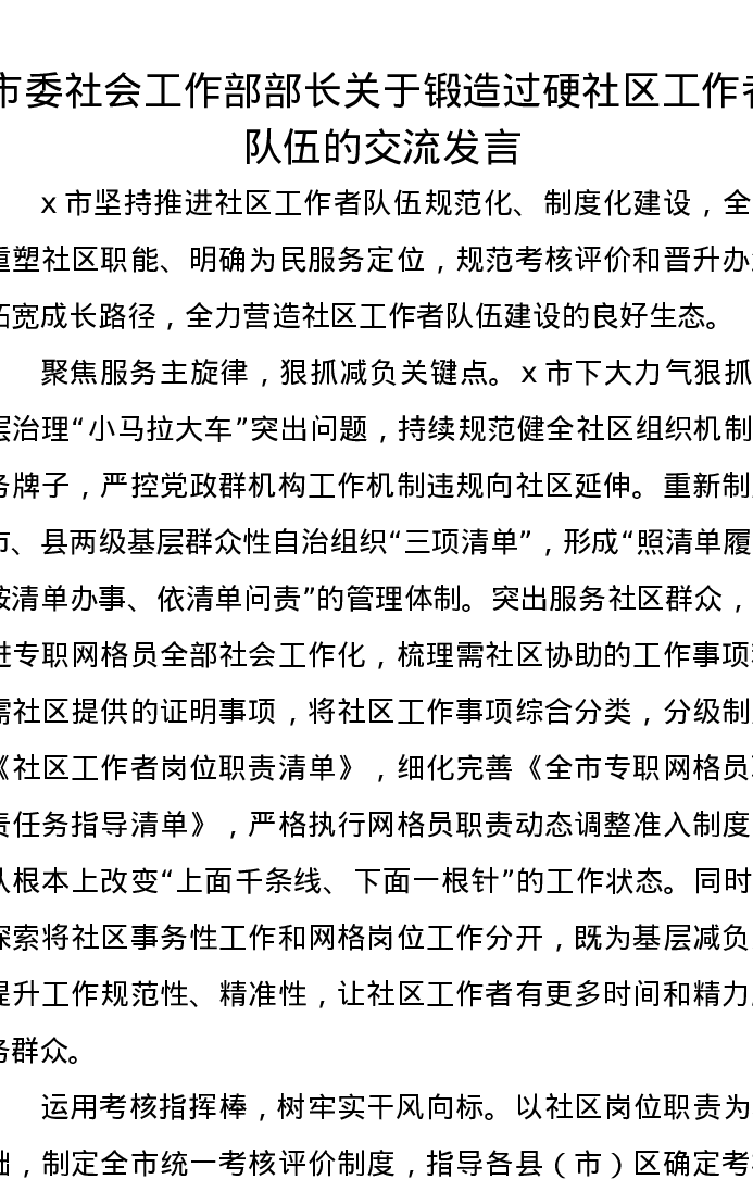 市委社会工作部部长关于锻造过硬社区工作者队伍的交流发言