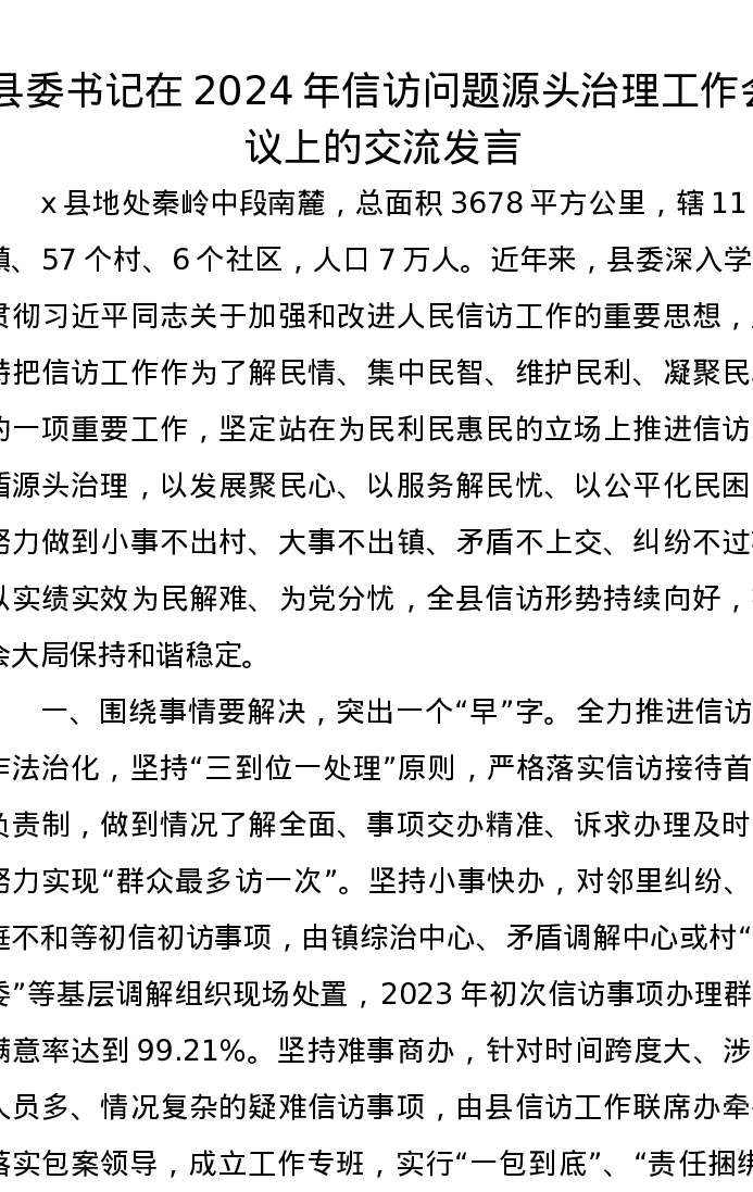 县委书记在2024年信访问题源头治理工作会议上的交流发言
