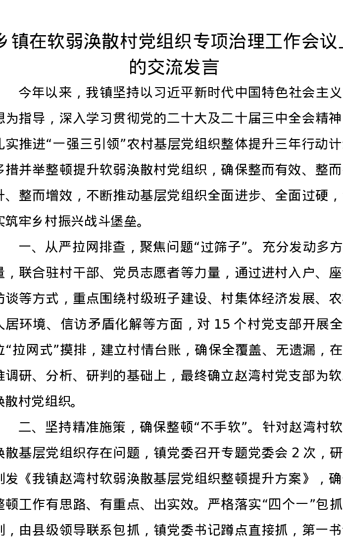 乡镇在软弱涣散村党组织专项治理工作会议上的交流发言
