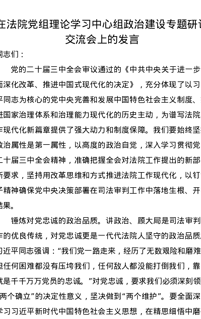 在法院党组理论学习中心组政治建设专题研讨交流会上的发言