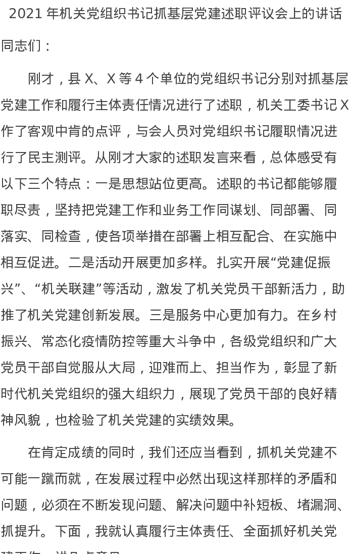 20220214-2021年机关党组织书记抓基层党建述职评议会上的讲话