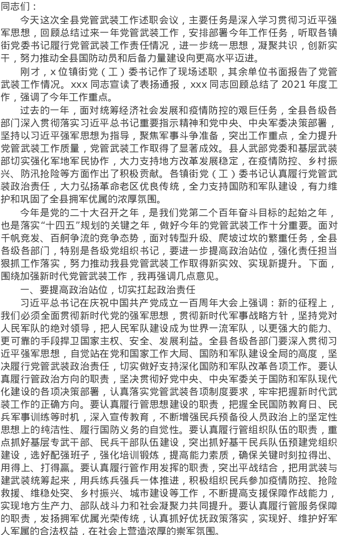 20220224县委书记在全县2022年党管武装工作述职会议上的讲话