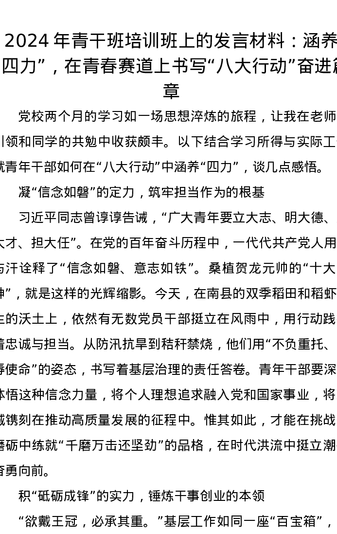 2024年青干班培训班上的发言材料:涵养“四力”,在青春赛道上书写“八大行动”奋进篇章