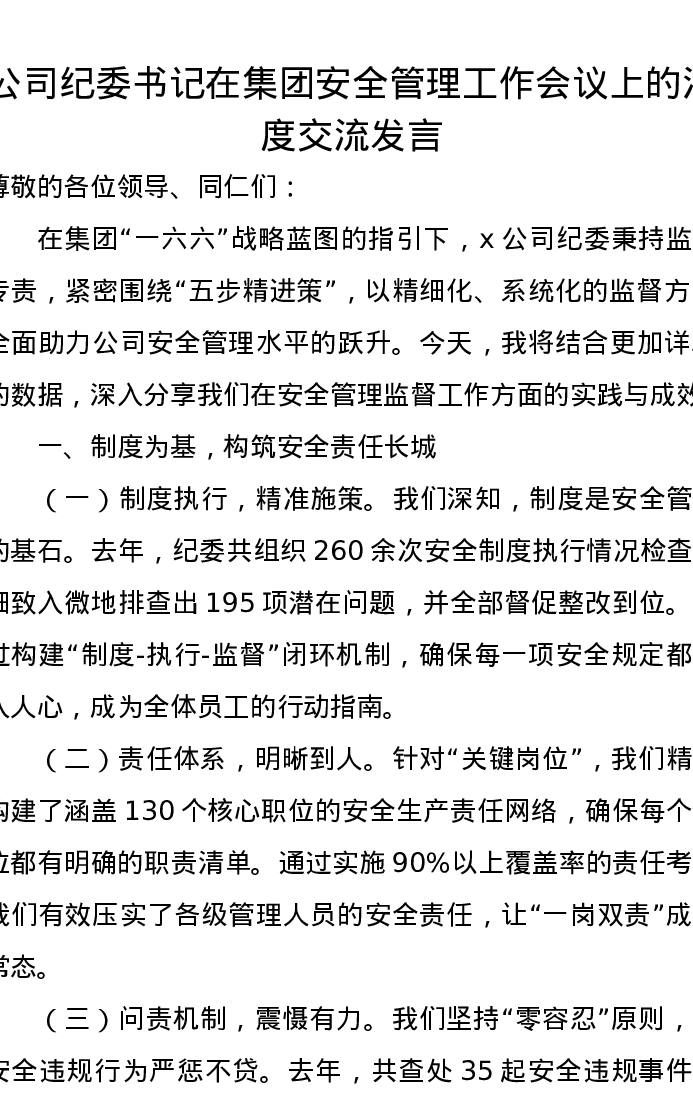 公司纪委书记在集团安全管理工作会议上的深度交流发言
