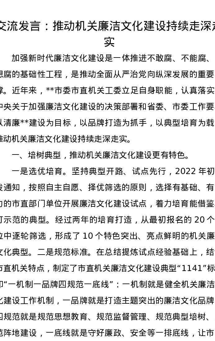 交流发言:推动机关廉洁文化建设持续走深走实
