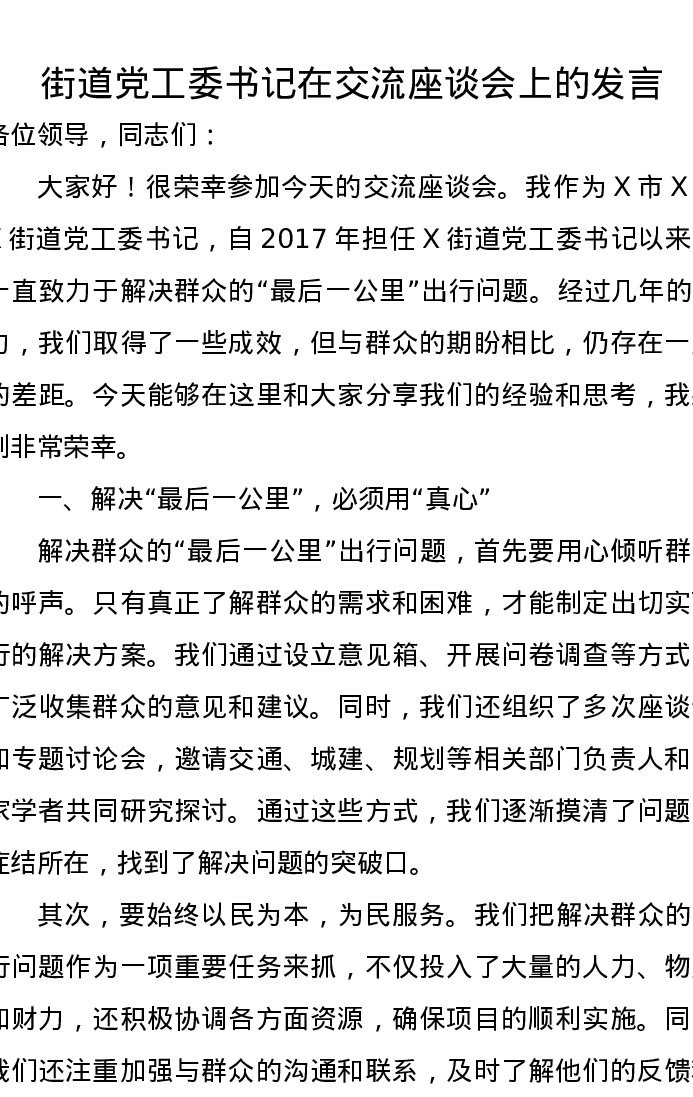 街道党工委书记在交流座谈会上的发言