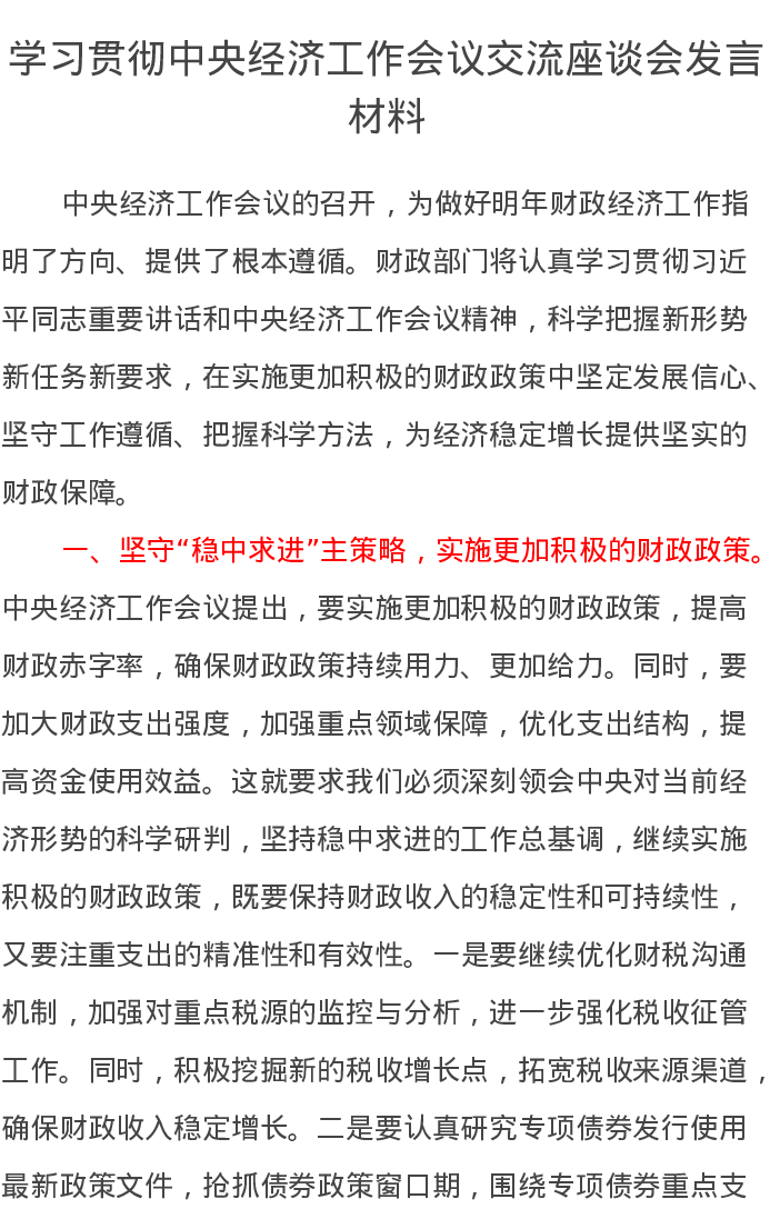 学习贯彻中央经济工作会议交流座谈会发言材料