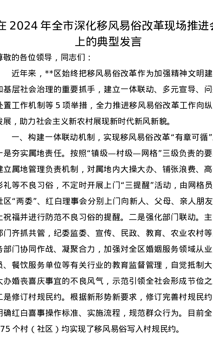 在2024年全市深化移风易俗改革现场推进会上的典型发言