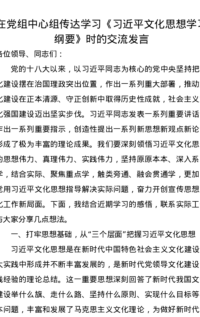 在党组中心组传达学习《习近平文化思想学习纲要》时的交流发言