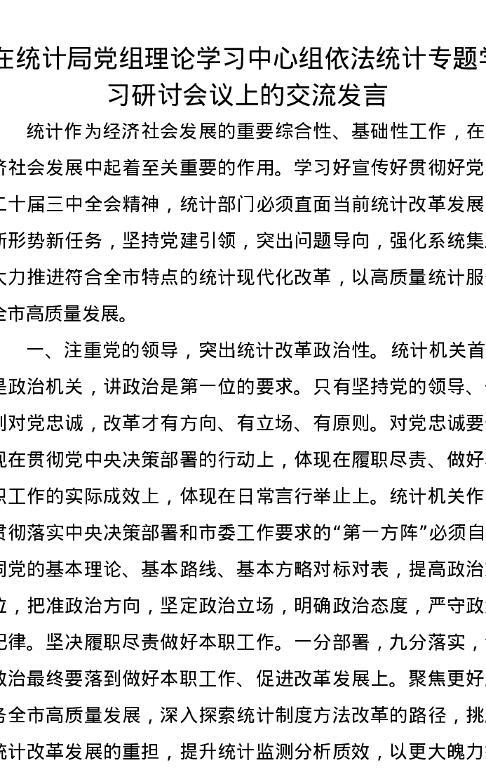 在统计局党组理论学习中心组依法统计专题学习研讨会议上的交流发言