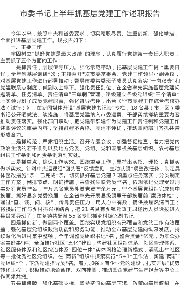 20220731市委书记上半年抓基层党建工作述职报告