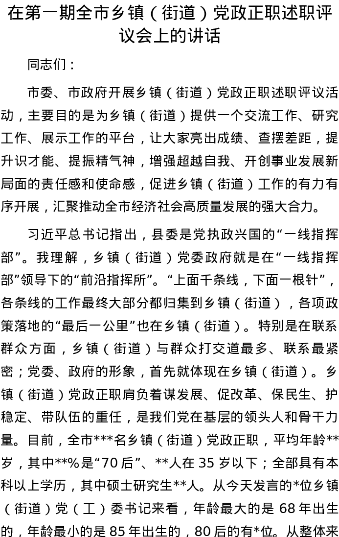 20220822在第一期全市乡镇(街道)党政正职述职评议会上的讲话